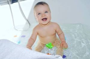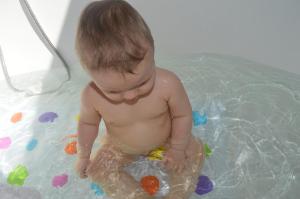 Maar…Daan wordt er niet kleiner en rustiger op… haha het is echt een wilde bras die geen controle heeft over zijn lijfje in het water. Door de bruuske bewegingen en badolie kan hij wel eens wegschuiven.