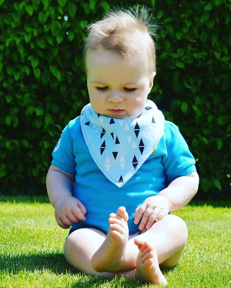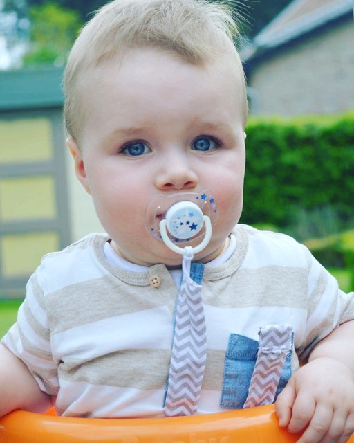Daan met een slabbetje, speenkoord en bijtring van Krukelz