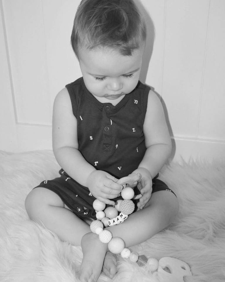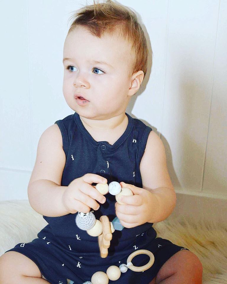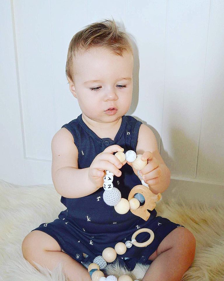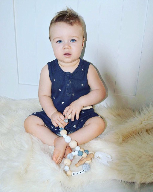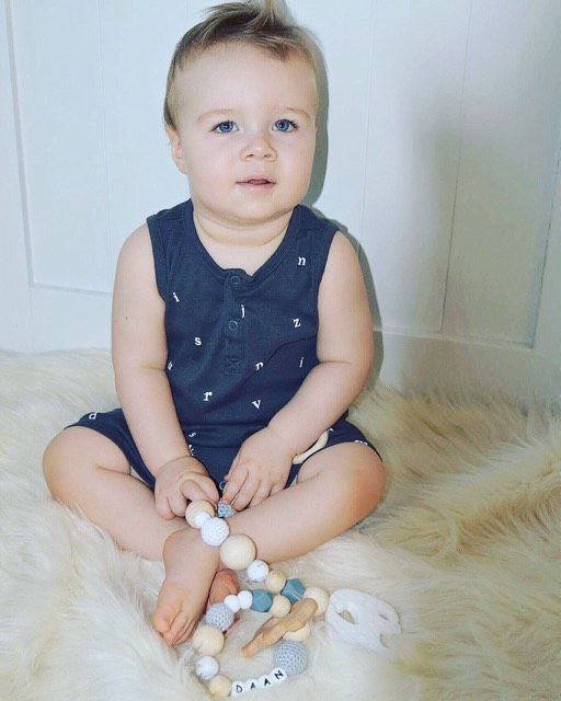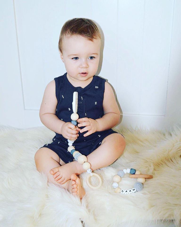 Daan mocht voor Babykraaltjes modelletje zijn en daarom mochten we 2 producten kiezen. Superleuk en ik was zeer benieuwd. Ik heb voor Daan een bijtring en speelkoord laten maken. Het resultaat is echt fantastisch en o-zo mooi. De kleuren passen perfect bij elkaar. Ik ben verliefd !