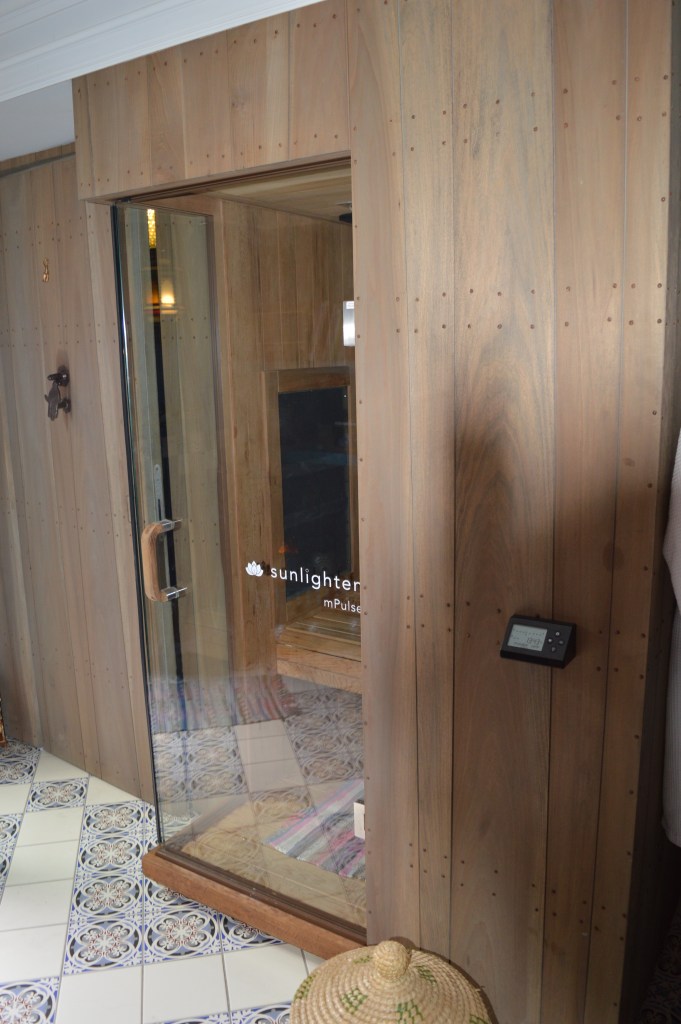 We hebben de volgorde van de wellness gevolgd, hoe het ons werd aangeraden. Normaal douchen we altijd eerst en daarna de jacuzzi in maar nu hebben we er ons echt aan gehouden. Ik heb me eerst gereinigd met de professionele verzorgingsproducten die er ter beschikking stonden. We zijn gestart met douchen om daarna een lekker warm voetbad te nemen met een speciale zwarte zeep. Wow, dat rook echt heerlijk en mijn voeten voelden aan als babyvoetjes. Daarop volgend gingen we in de infrarood sauna. Dit deed echt enorm deugt voor mijn spieren, rug en bekkenpijn. Hierna even bekomen en een glaasje water.