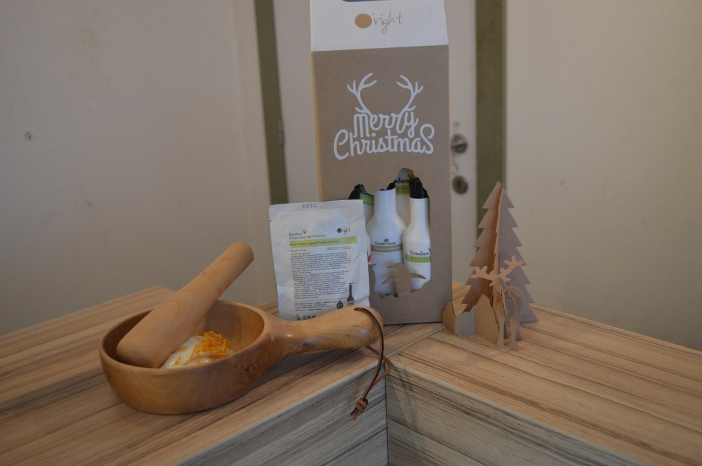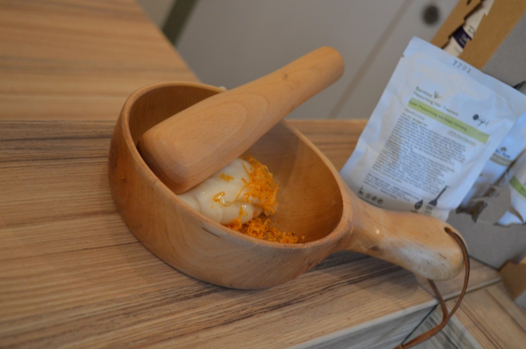 Daarna werden mijn haren verwend met een “Bamboo moisturizing hair treatment”. Claudia had er wat sinaasappelschil in gedaan en dat maakte het echt volledig af. Het was niet alleen hemels voor mijn haren maar het zag er zelfs eetbaar uit haha. Na een aantal minuten inwerken werd dit uitgespoeld.