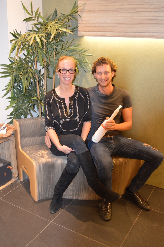 Hieronder kan je een foto zien van Claudia met haar man. 🙂 De bank waarop ze zitten is heel bijzonder…Deze is gemaakt van 40 kartonnen dozen! Kan het nog meer Eco? ❤ ❤ WE LOVE