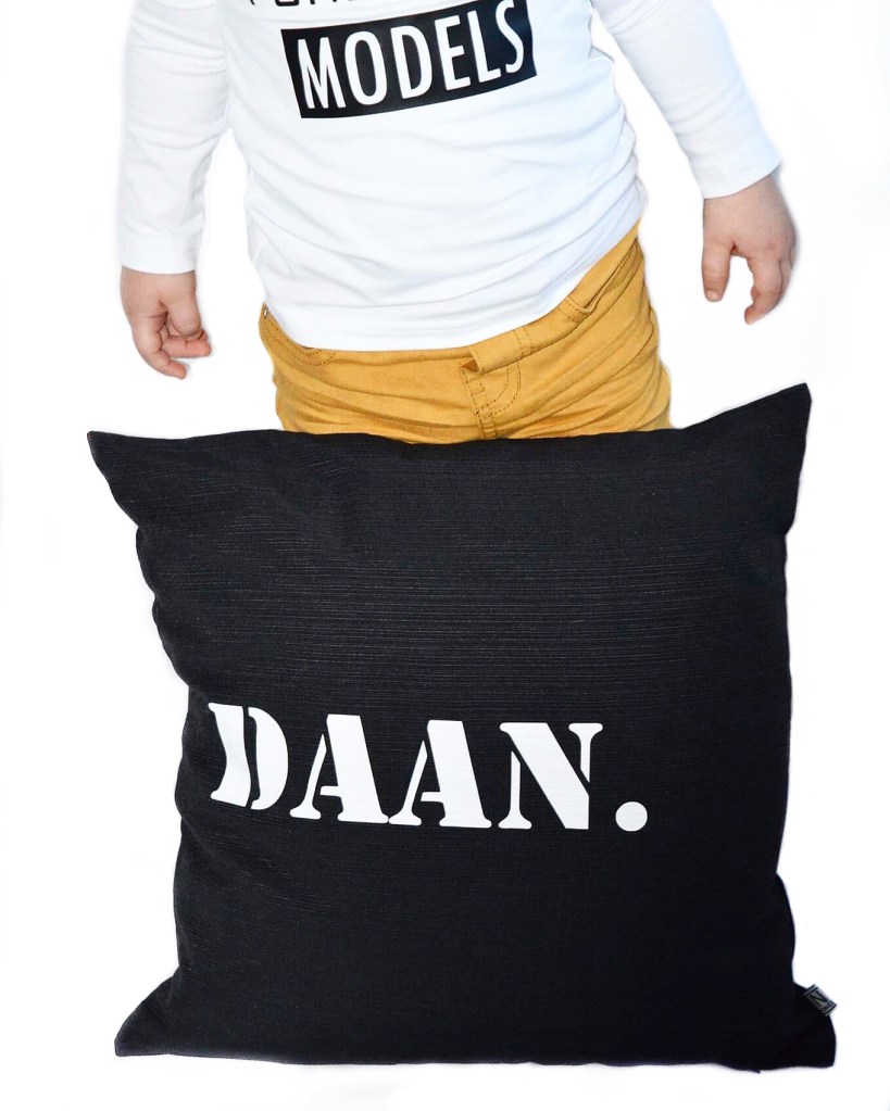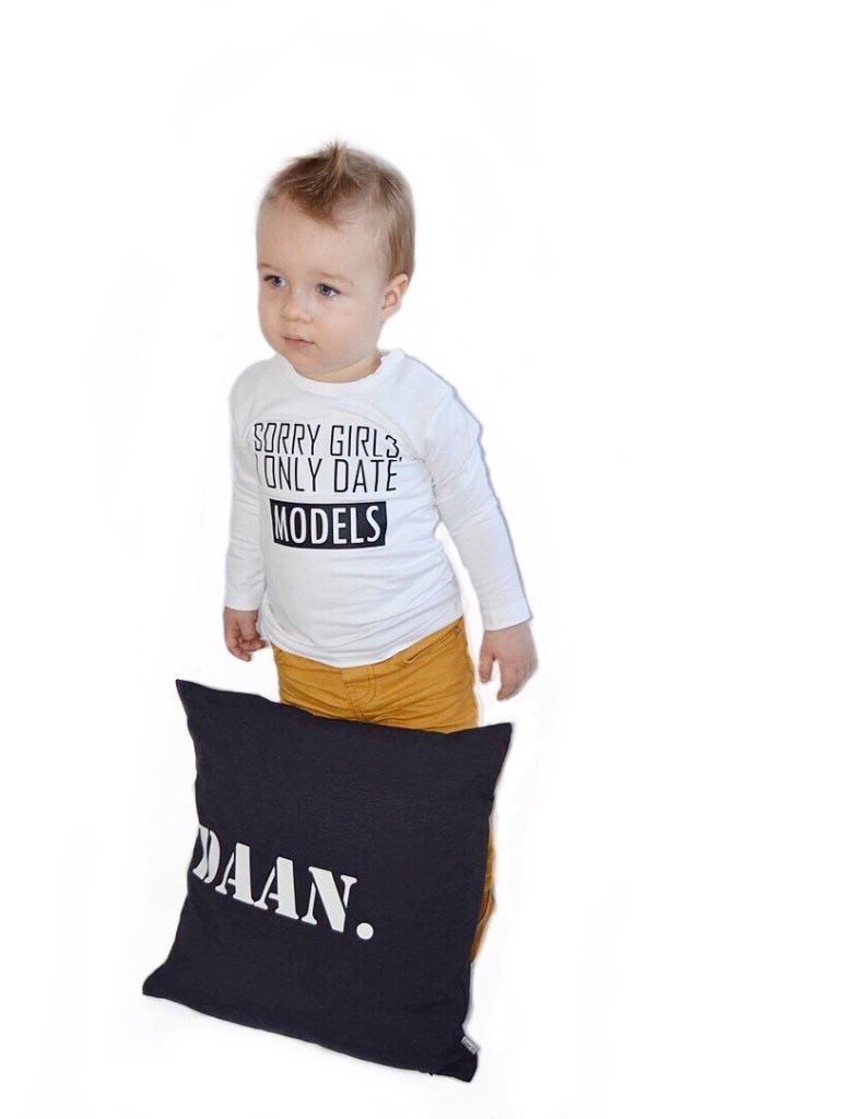 Daan als modelletje voor de shirts én het hele mooie gepersonaliseerd kussentje
