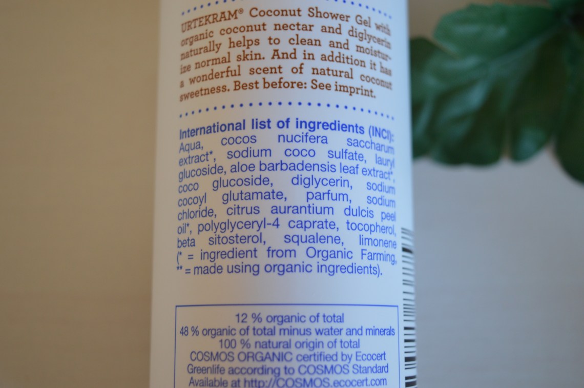 Het eerste wat ik doe is het flesje opendraaien en eens aan ruiken. De geur is lekker zacht en niet een synthetische kokosgeur. De douchegel is gemaakt van biologische kokosnectar. Het bevat ook diglycerine dat helpt bij het natuurlijk reinigen en vocht inbrengen van de huid.