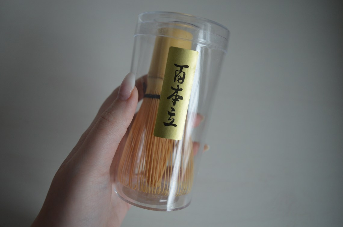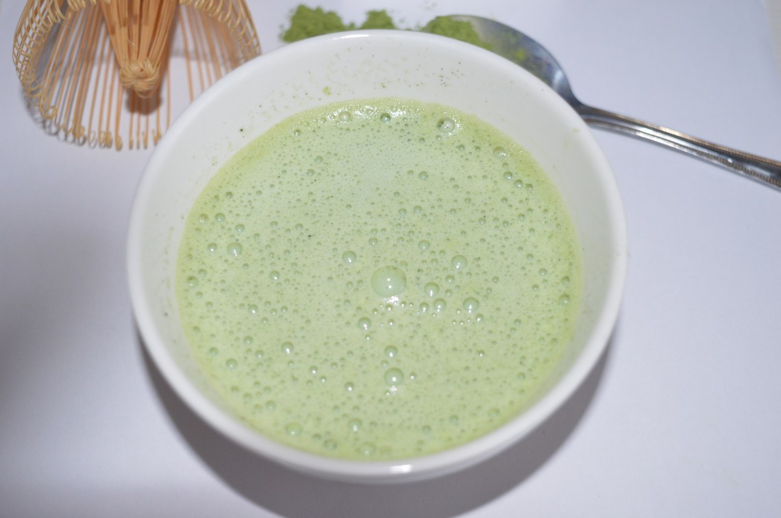 Ik heb voor mijn eerste Matcha ervaring dit gemaakt met melk. Een Joy of Matcha Latte dus. Echt heer-lijk! Door het opkloppen krijg je ook een klein schuimlaagje wat ik ook heel aangenaam vind in mijn mond. Het opkloppen doe je met de handgemaakte bamboe matcha klopper.