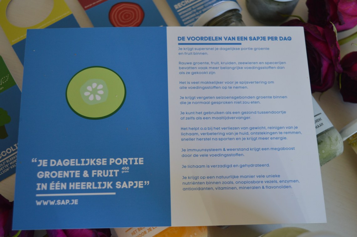 Een mooie ervaring en zeker voor herhaling vatbaar! Wist je dat je trouwens ook de Sapjes apart kan aankopen? Heb je het bijvoorbeeld moeilijk om aan je dagelijkse hoeveelheid groenten en fruit te komen? Dan kan je elke dag een sapje nemen en zo toch voldoende voedingsstoffen, vitaminen en mineralen binnen te krijgen. I-de-aal. A Sapje a day keeps the doctor away 😉
