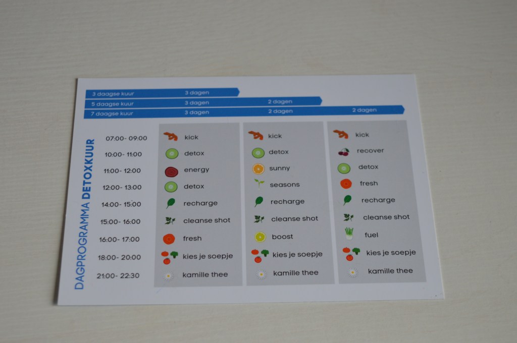 Na mooi 3dagen te gaan voorbereiden was het tijd om te gaan detoxen. Ik had er veel zin in. In de box zit een dagprogramma zodat je kan zien op welk uur je wat gaat drinken.
