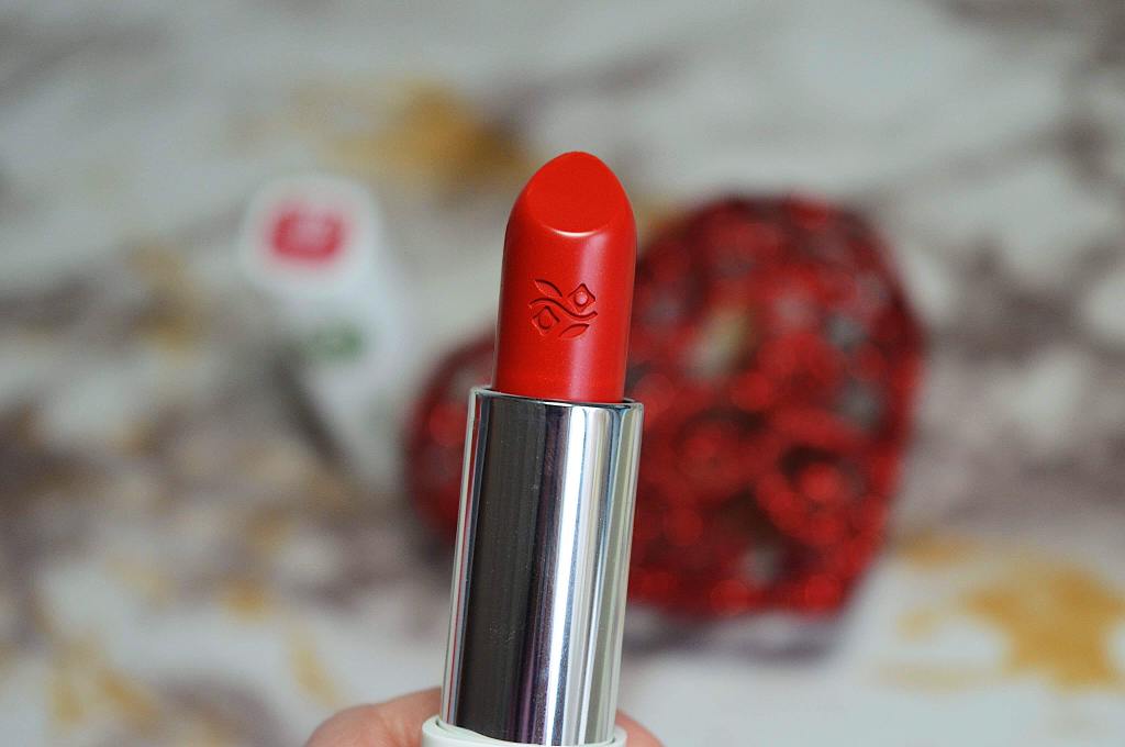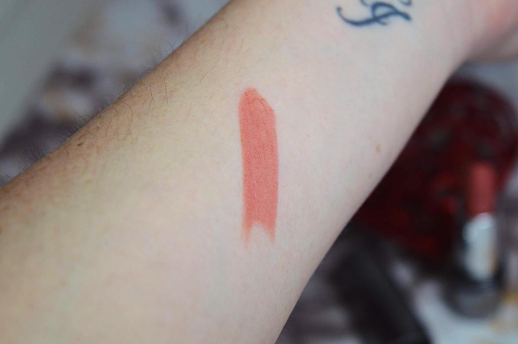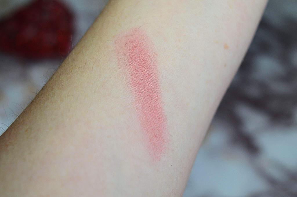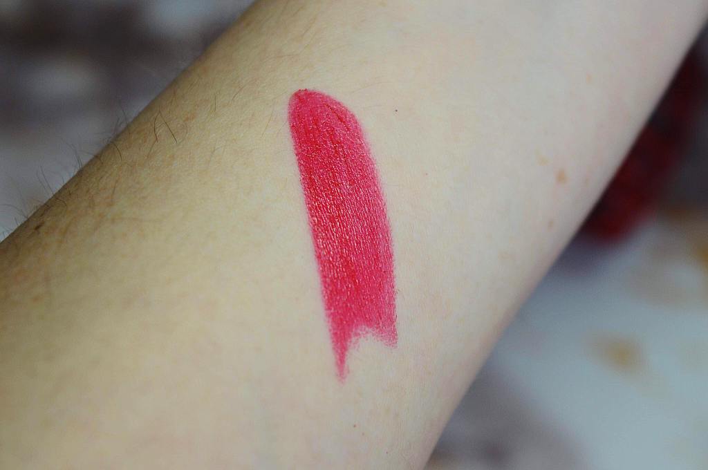 De lipstick is hoog gepigmenteerd door het robijnpoeder. Vanaf je eerste swipe zijn je lippen al zeer mooi gedekt. Zijn performance is echt top! Je kan gerust eten en drinken, de kleur blijft strak op je lippen. Oké als je de hele dag zou gaan eten, en je mond af deppen en met je geliefde zou kussen…dan kan het wel eens nodig zijn om bij te gaan stiften 😉