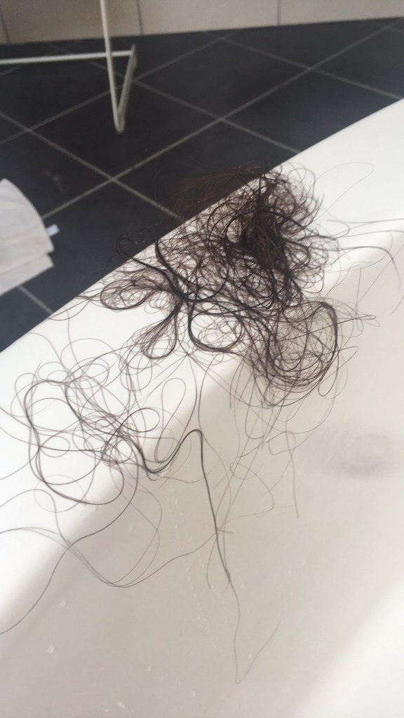 Onlangs heb ik dan ook terug de stap durven zetten richting mijn kapster. Ik had echt een enorme uitgroei maar ik durfde het gewoonweg niet te laten kleuren. Het kleuren verliep goed maar er zijn wel nog een aantal plukken meegekomen. Toen ze begon met het drogen van mijn haren heeft ze mij kunnen tonen hoeveel haar ik precies wel niet ben verloren. Ongeveer de helft van mijn haar is uitgevallen. Het goede nieuws is wel dat ze kon zien dat mijn haren al volop terug aan het groeien zijn. Bij het brushen viel dat enorm op. Echt banden haren van ongeveer 10 cm en meer. Mijn haar moet trouwens al langer aan het uitvallen zijn geweest dan ik vermoedde.