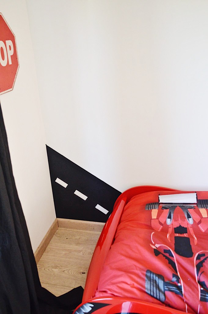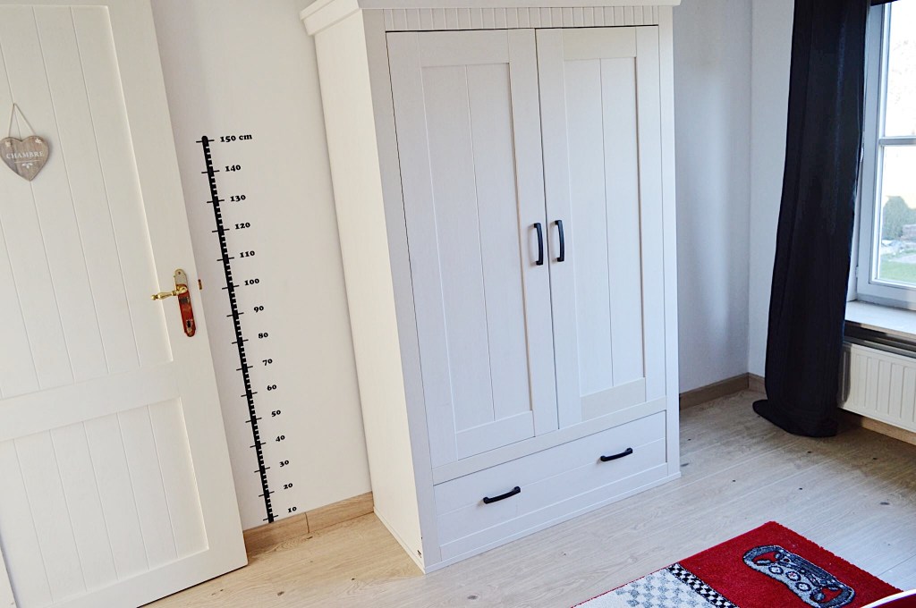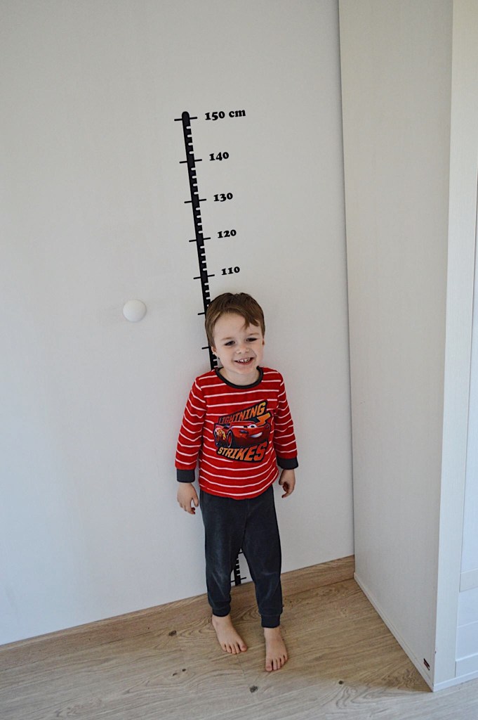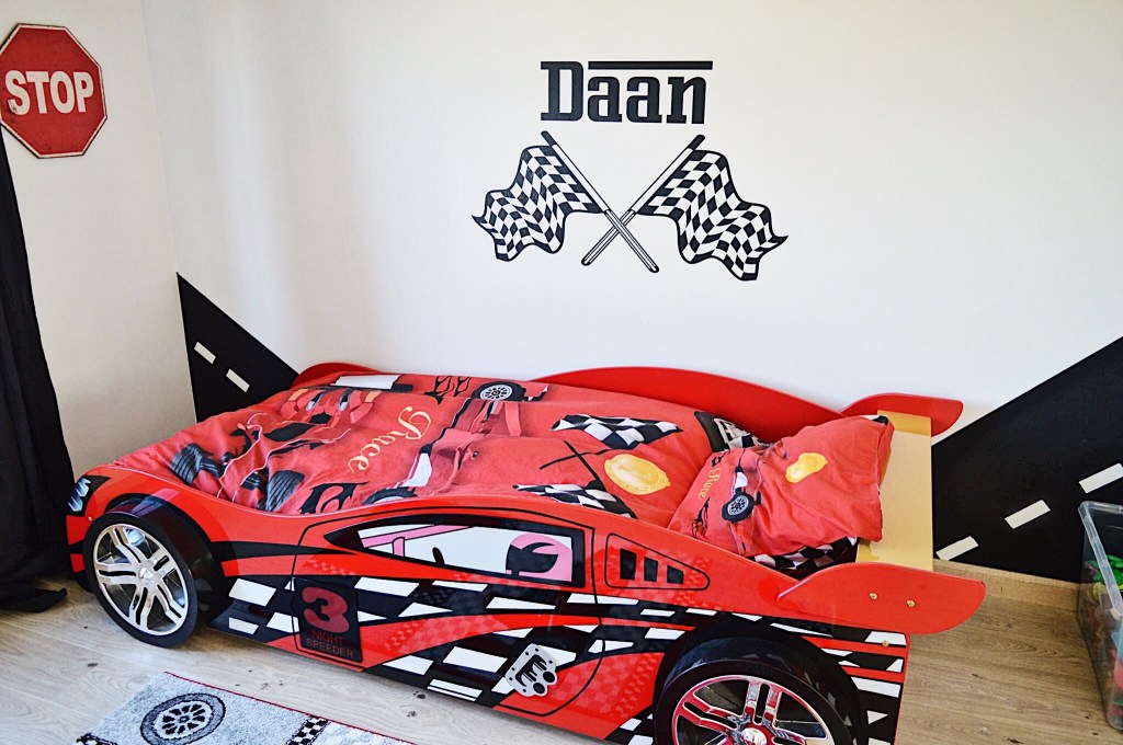 Wat een fantastische kamer. Mijn zoontje heeft ook zo’n mooi autobed. Nu gaan we verhuizen en wil zijn kamertje net iets meer afmaken. Ik vind de foto met de vlaggen op de muur erg leuk en de naam van je zoontje en delen van de racebaan op de muur. Ook het meetsysteem om te kijken hoe groot ze zijn is erg leuk! Mag ik vragen hoe je dit gedaan hebt?