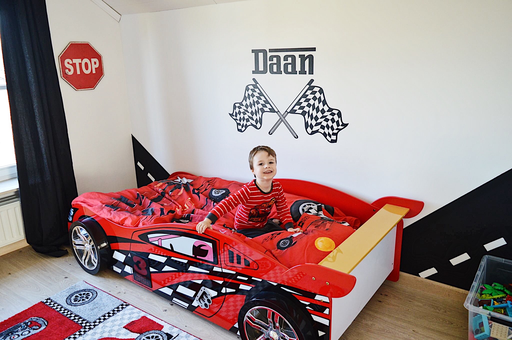 Voor Daan lijkt het bed een echte raceauto. Hij is er zó trots op! Dit maakte de overgang ook zeer gemakkelijk. Daan sliep dan ook meteen lekker door en wennen was zo goed als niet nodig. Oké, er zijn wel dagen bij dat hij in de nacht nog eens bij ons komt kruipen, maar zeg nu zelf, welke peuter/kleuter doet dit niet?