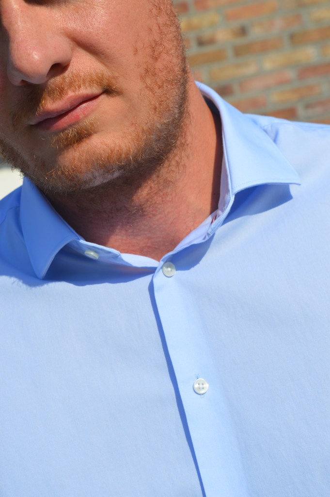 Het is een strak getailleerd business hemd met een borstzak en lange mouwen. Daarnaast een spread collar, zichtbare taillenaden zowel voor als achterkant en de onderkant van het hemd is rond gesneden. Dat rond gesneden vindt hij trouwens geweldig. Als je dan gaat neerzitten, heb je geen last van een blote rug.