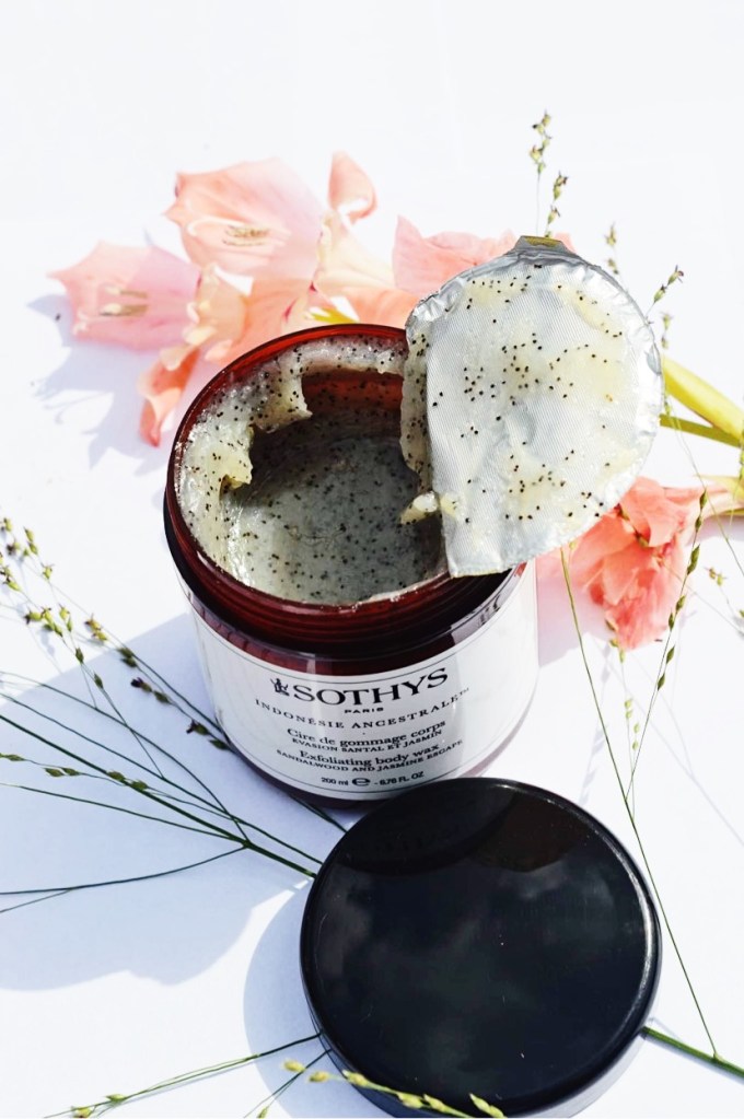 Cire de gommage corps – 200 ml – €44: Scrubben, o zo belangrijk voor een zachte en mooie gave huid. Scrubben stimuleert en zet aan tot celvernieuwing. Voor een zachte en soepele huid, scrub je best 2 maal per week. Deze body wax van Sothys heeft het allemaal! Een zalige wasachtige textuur, verrijkt met 100% natuurlijke exfoliërende korrels uit biologisch rietsuiker en minuscule deeltjes kokosnootschil. De scrub bevat ook een hoge concentratie aan voedzame exotische oliën die de huid laat stralen en lekker laat ruiken naar Jasmijn.