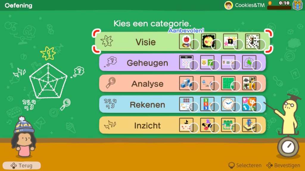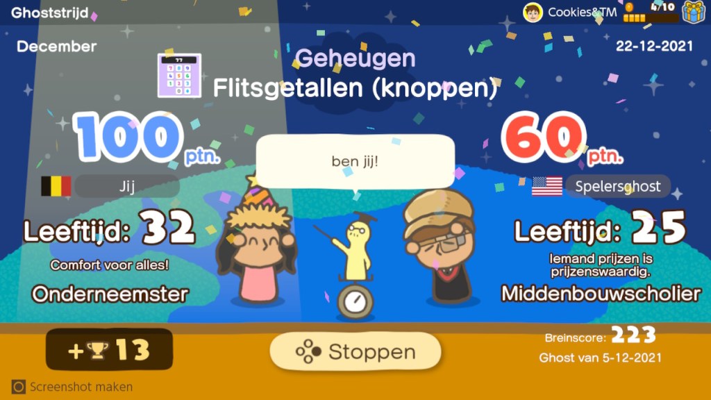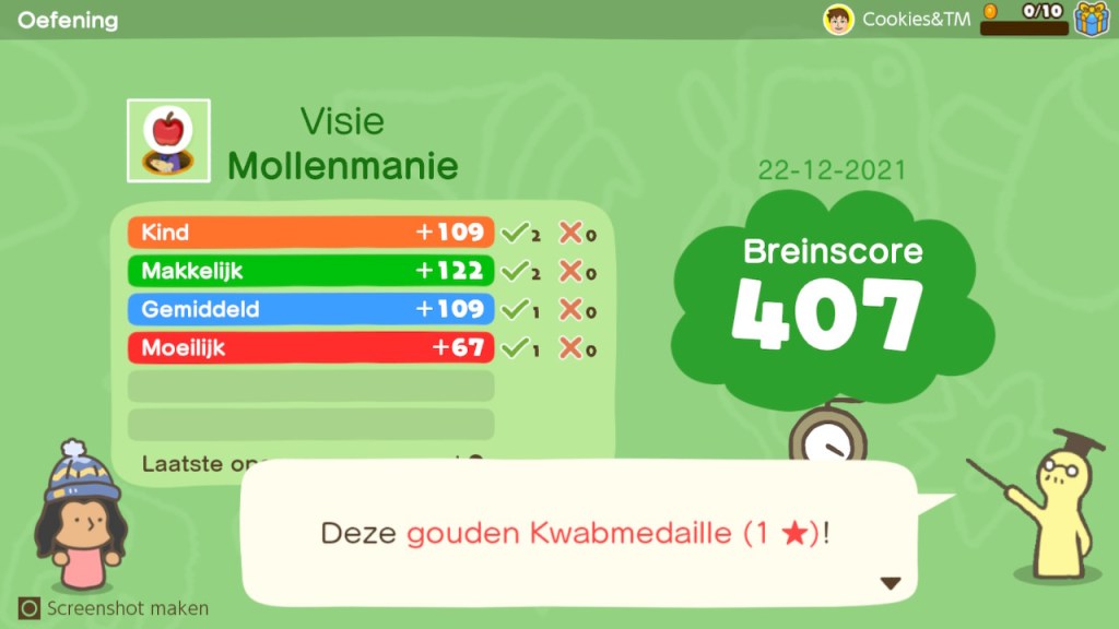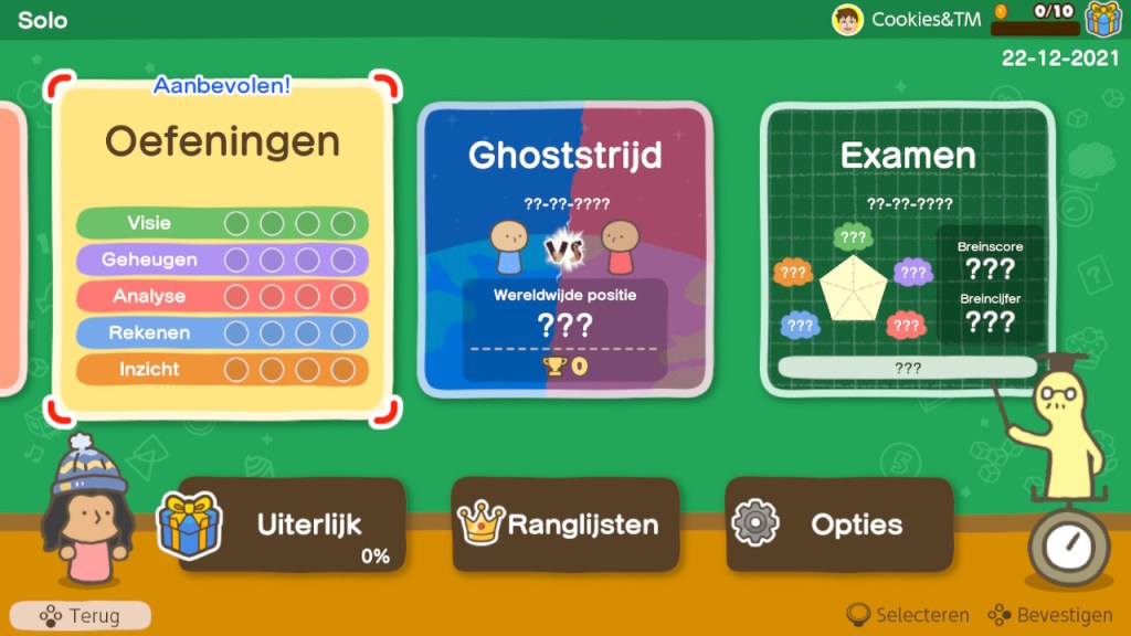 Naast de oefeningen kan je ook een examen afleggen om je breinscore te bepalen en kan je op die manier aan vaardigheden of snelheid werken door te oefenen in solostand. Hoe meer je speelt, hoe meer outfits er kunnen worden vrijgespeeld om je personage aan te kleden. Echt heel leuk.